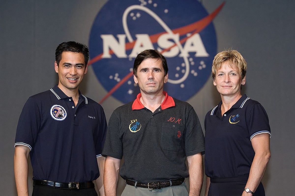 (Soyuz TMA-11 Crew photo. From left: Dr. Sheikh Muszaphar, Yuri Malenchenko and Peggy Whitson. Source: NASA Spacefllight)